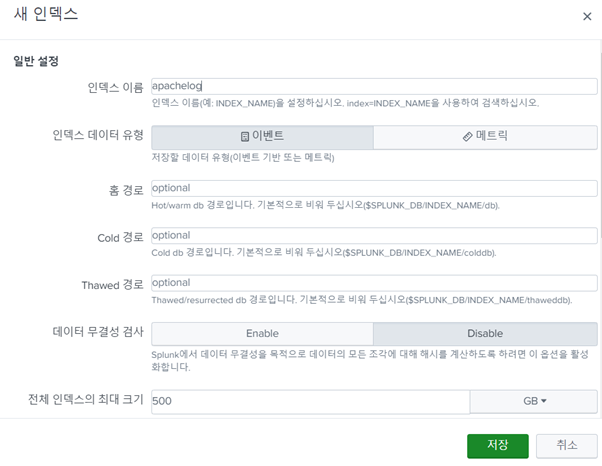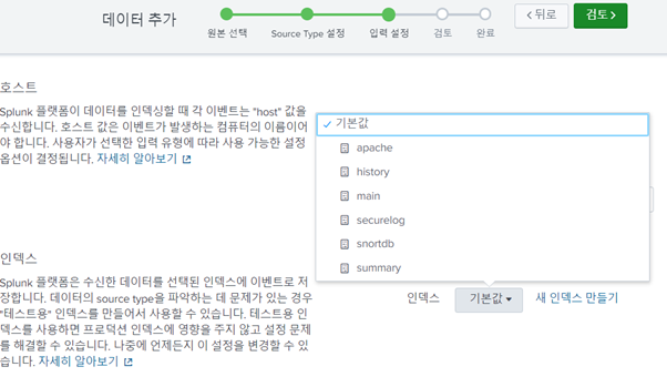 다음으로 넘어와서 확인하게 되면 인덱스가 다음과 같이 있는데 Splunk는 기본적으로 main으로 돼있기 때문에 따로 지정해주지 않으면 main으로 데이터가 넘어간다.