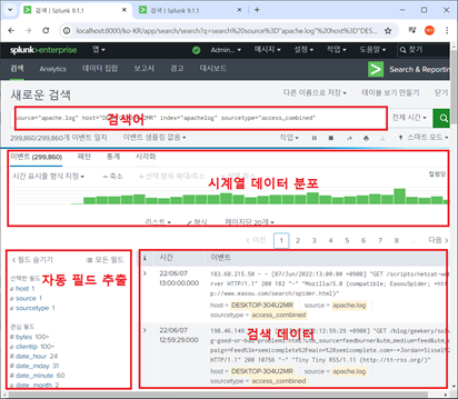 - SQL 기능과 Unix파이프라인 구문이 결합된 최적의 검색 언어인 SPL 지원